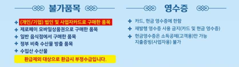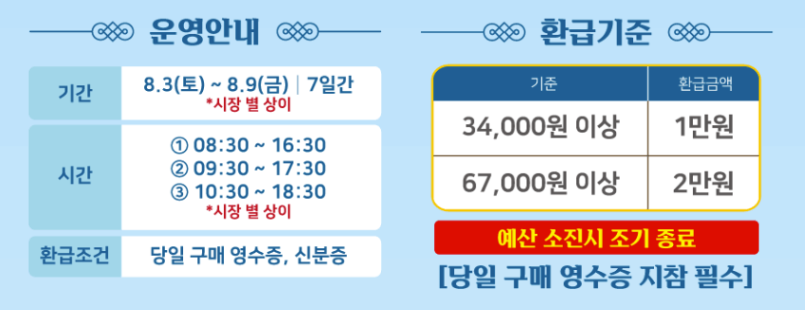 (시장별로 상이하니, 아래 링크에서 방문하려는 시장 정보를 꼭 확인하세요!) - 준비물: 당일 구매 영수증, 신분증 또는 개인 신용카드