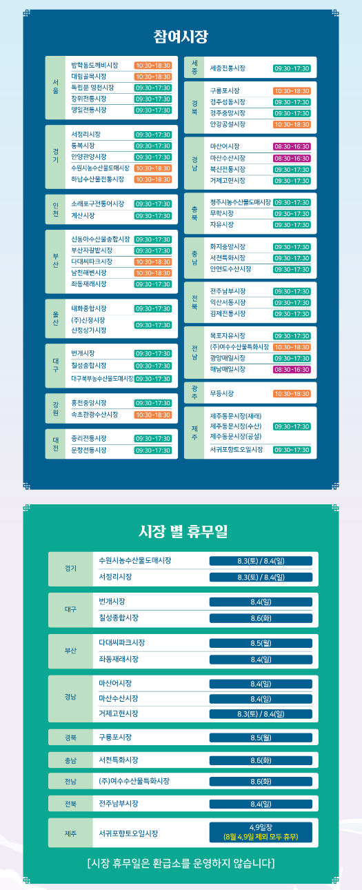 방문을 계획하는 지역의 시장이 대한민국 수산대전 온누리상품권 환급 행사에 참여하는지 꼭 사전에 확인하고 방문하시기 바랍니다. 시장별로 운영시간과 휴무일이 다르기 때문에 반드시 확인 후 방문하셔야 합니다.